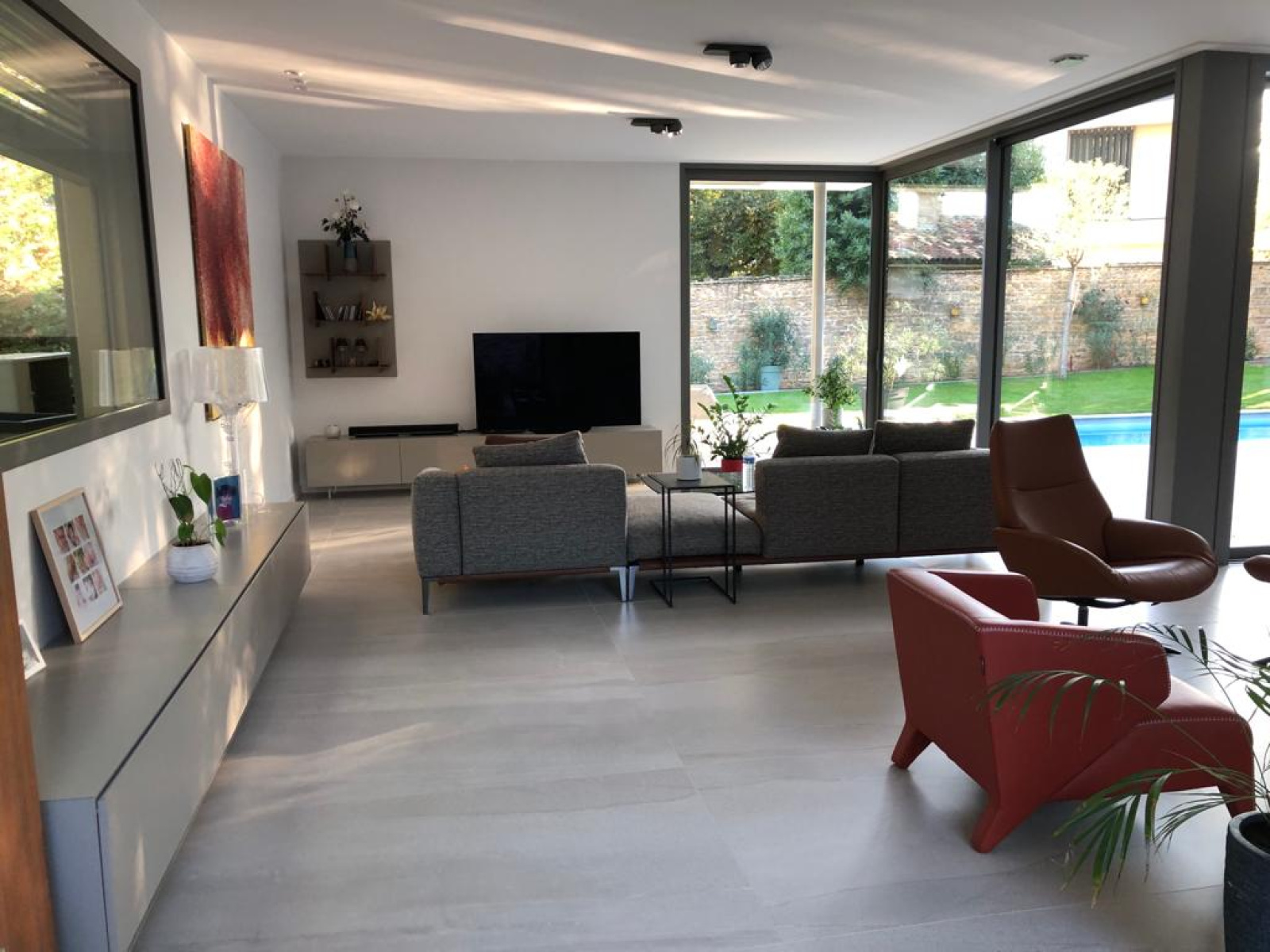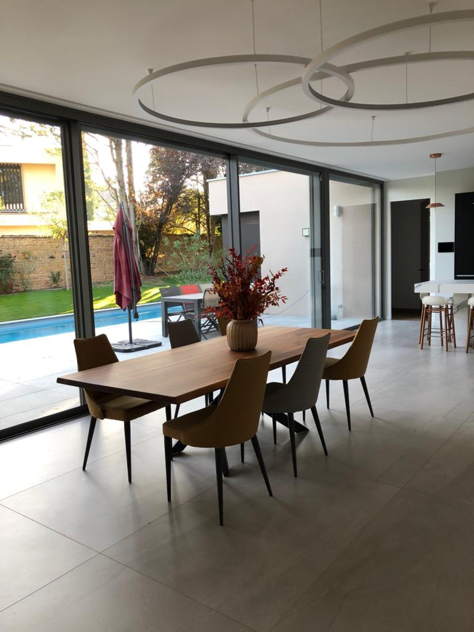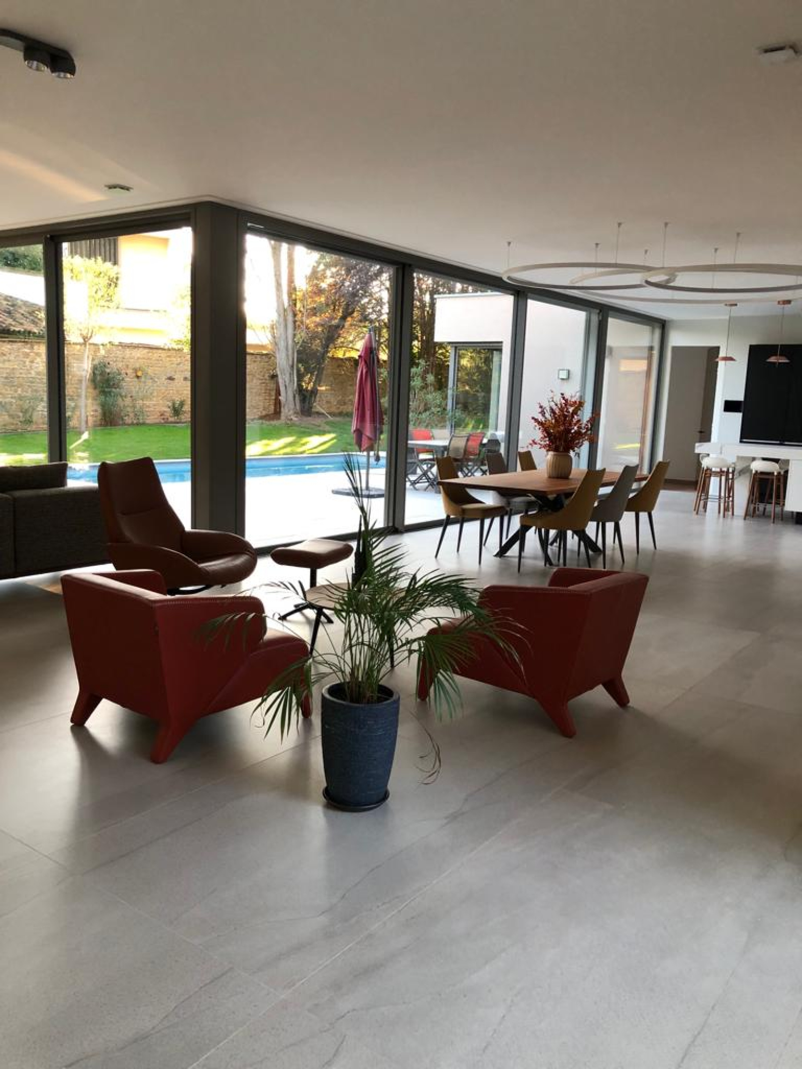 L’extérieur, conçu pour la détente et le bien-être, comprend une piscine élégante, un vaste terrain paysagé de 1 900 m², ainsi qu’un garage double et un local technique.